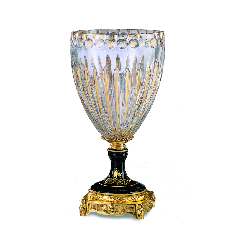 Bronzo dorato, cristallo trasparente decorato con oro zecchino e porcellana decorata