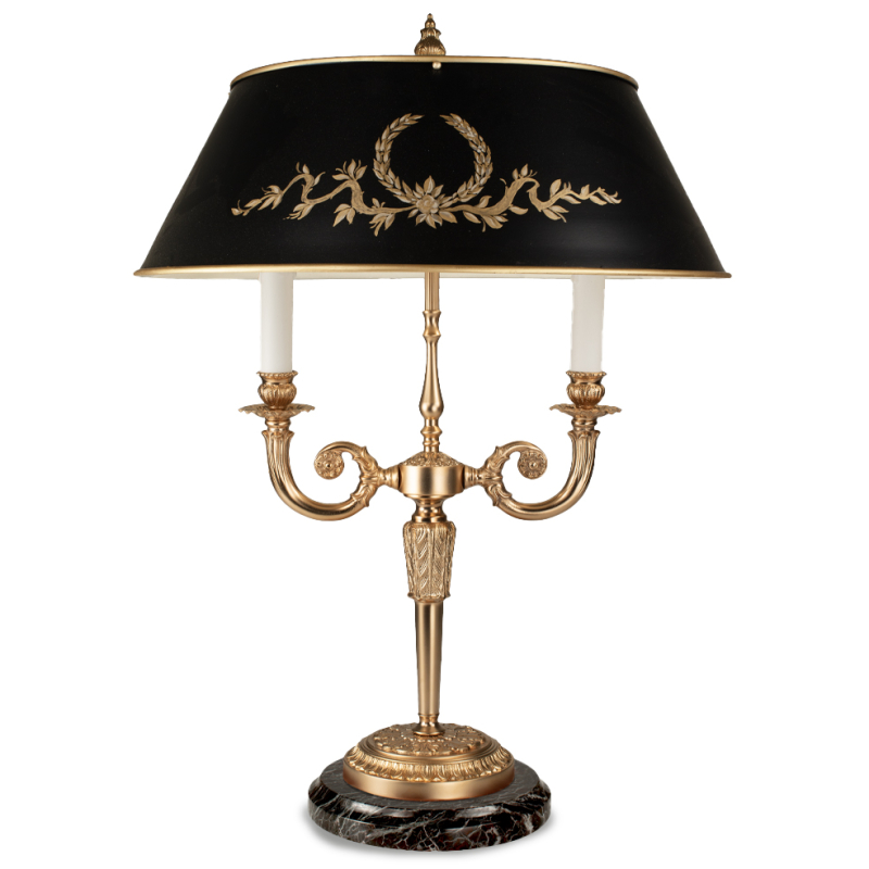 Marmo, bronzo dorato e paralume in metallo verniciato nero e decorato a mano in oro zecchino