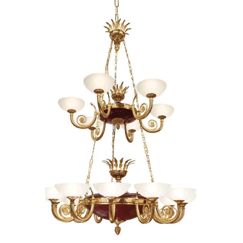 Bobeche in vetro satinato, bronzo dorato e metallo verniciato porpora