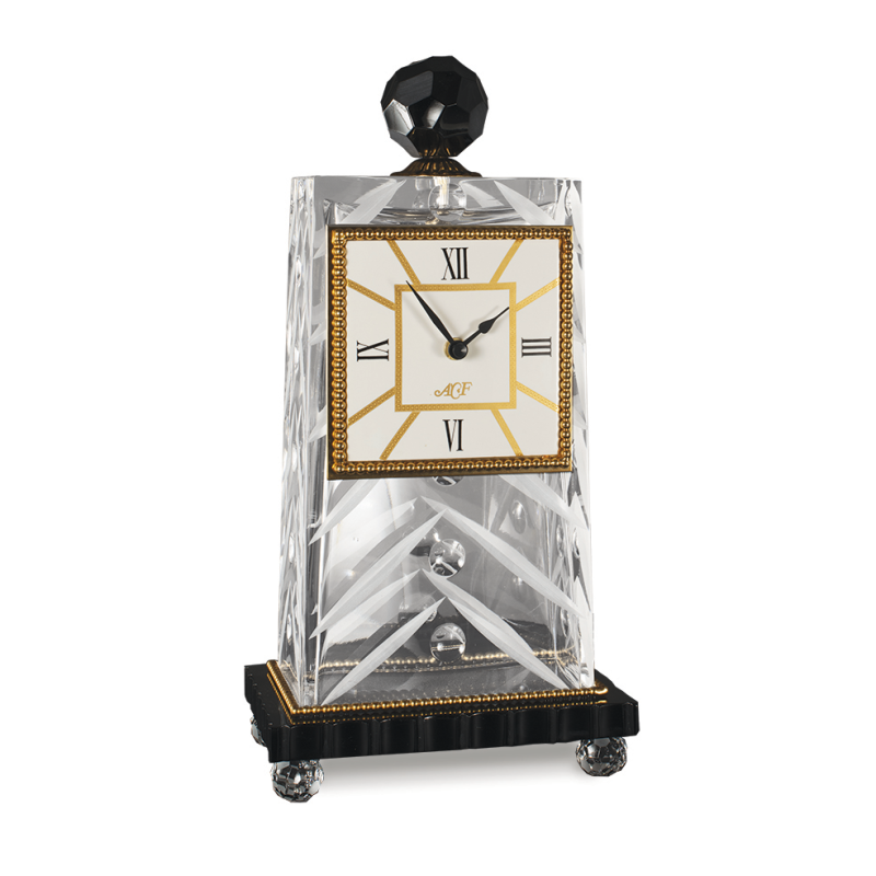 Bronzo dorato, cristallo chiaro e nero, porcellana decorata