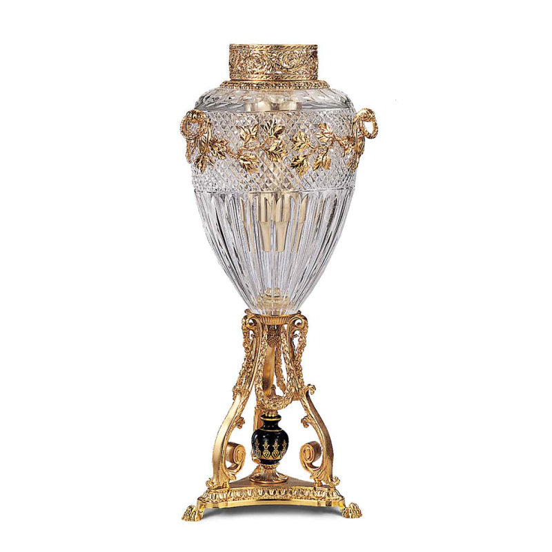 Bronzo dorato, porcellana decorata e cristallo trasparente