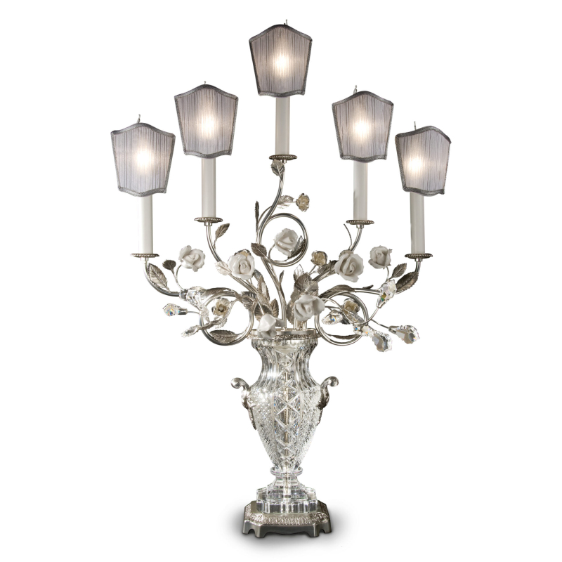 Cristallo chiaro e ottone argentato, foglie in cristallo chiaro e rose in porcellana bianca