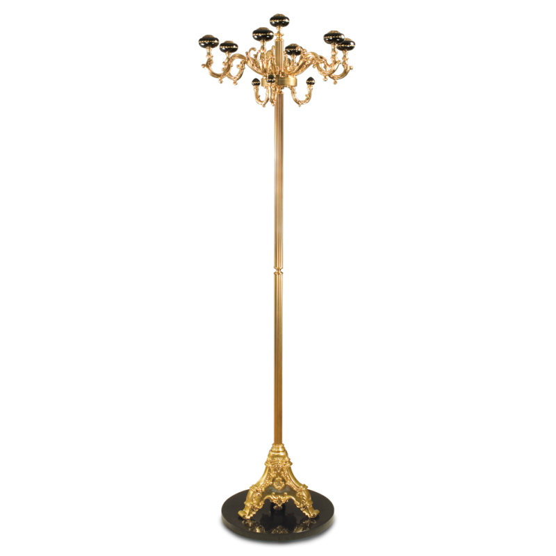 Ottone dorato, porcellana decorata e marmo nero brillante
