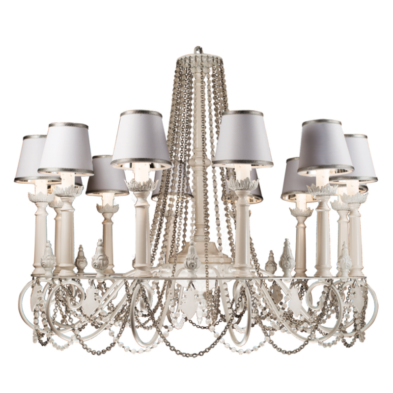 Porcellana bianca, metallo laccato bianco, cristalli sabbiati bianco opaco e catenine argento