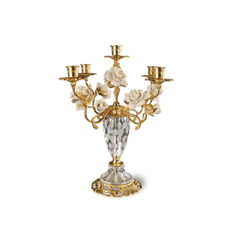 Bronzo dorato, cristallo chiaro e rose in bisquit “Capodimonte”