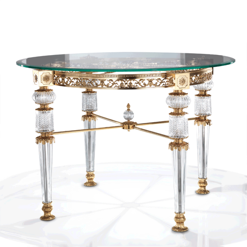 Bronzo dorato, cristallo chiaro e piano di vetro temperato