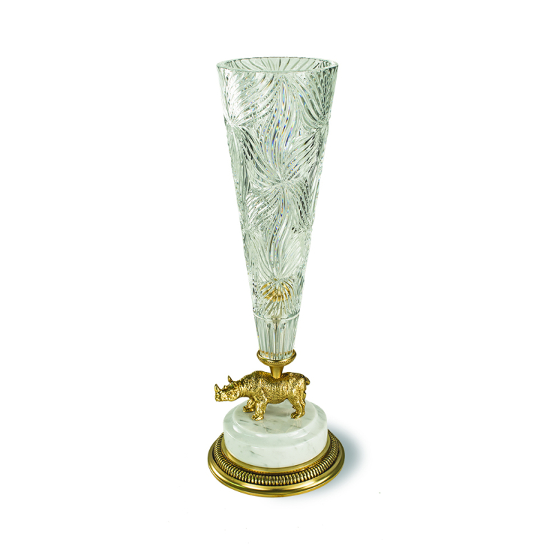 Золотая латунь, прозрачный хрусталь и белый мрамор с прожилками.