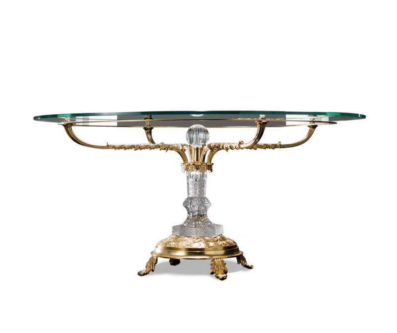 Позолоченная бронза, прозрачный хрусталь и столешница из закаленного стекла.