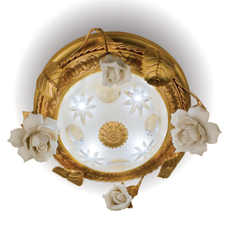 Золотистая латунь, диффузор из граненого хрусталя и розы из бисквитного цвета.
