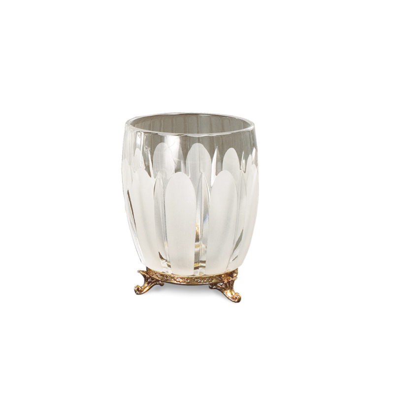 Золотая латунь и прозрачный хрусталь с непрозрачной ребристой и лицевой огранкой.