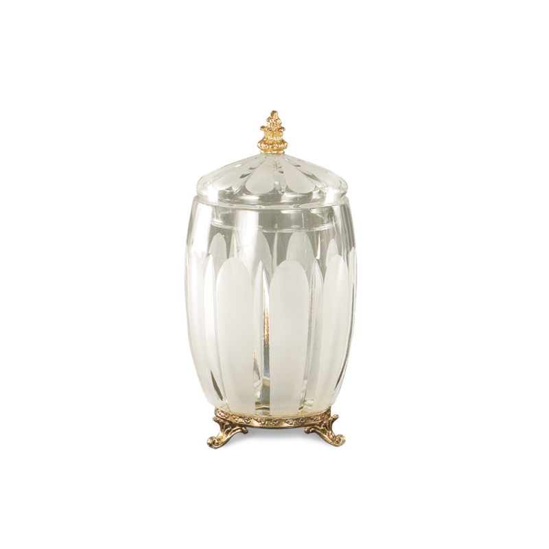 Золотая латунь и прозрачный хрусталь с непрозрачной ребристой и лицевой огранкой.