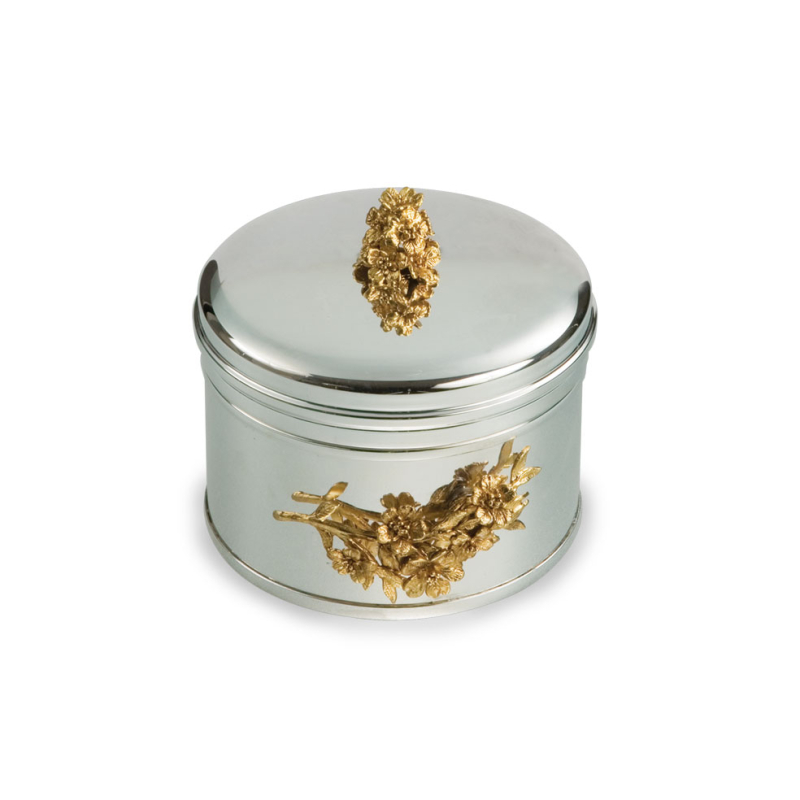 Хромированная латунь с золотистыми деталями, отлитыми по выплавляемым моделям.
